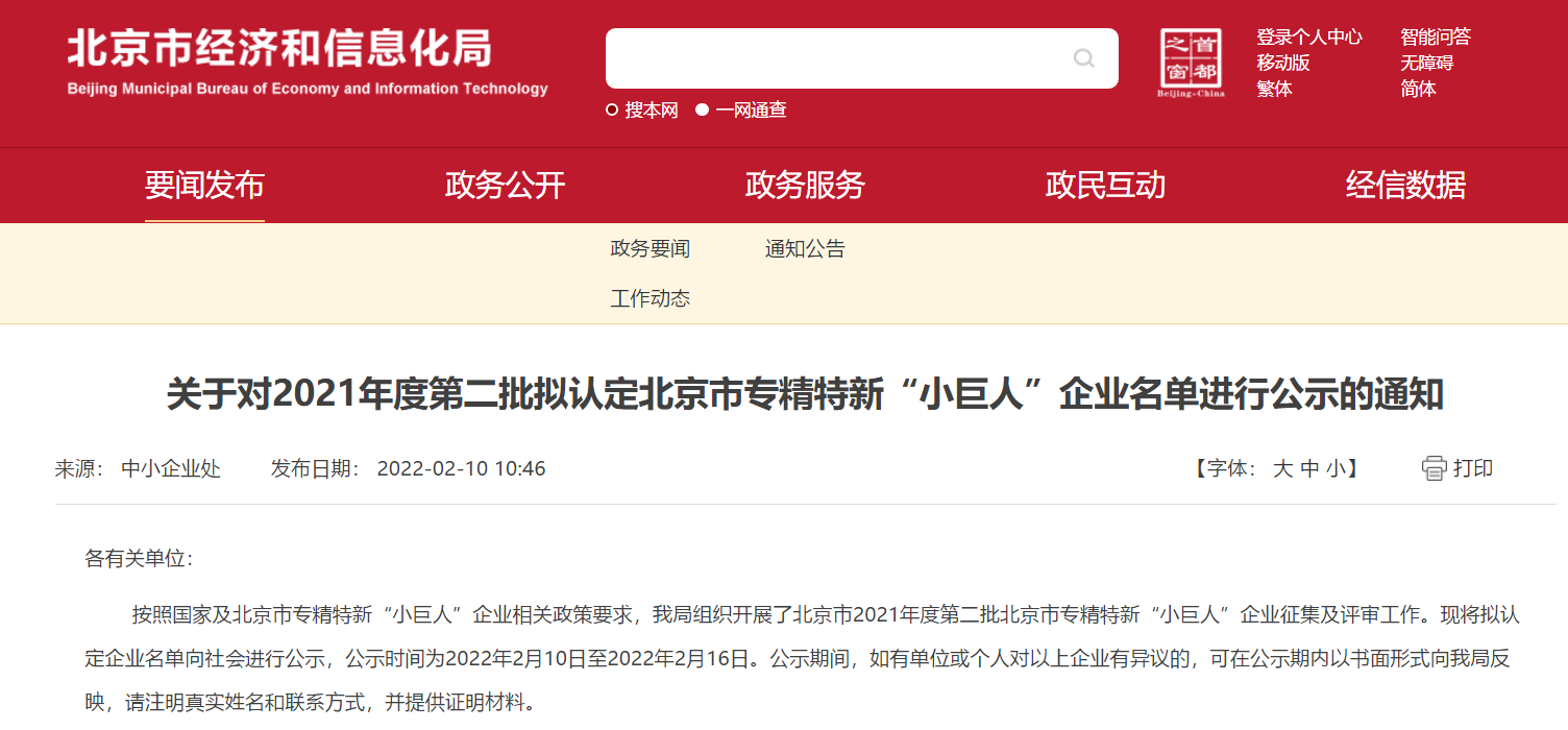 北京市经济和信息化局结合北京市实际,综合考察申报企业在经济效益、专业化程度、创新能力和经营管理等方面的指标,要求入选企业在细分市场内名列前茅,代表行业中前沿创新能力、掌握领域关键核心技术。